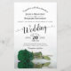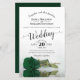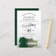 This beautiful budget or affordable wedding invitation features a romantic design with a single long-stemmed emerald green coloured rose laying on its side and reflecting in a pool of water. The typography features lacy script calligraphy and a sophisticated layout. The back is a marbled deep emerald or forest green colour. Wonderful way to invite your friends and family to share in your joy on your special day.