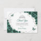 Emerald green silver and white floral Quinceanera thank you card. Features, script font, silver butterflies, watercolor roses and tiara. Perfect for an elegant princess style glam celebration. Personalize with your own details.