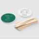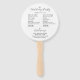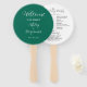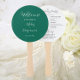 Wedding day program printed on a round style hand fan that features a trendy, emerald green colour background on the front side with the bride and groom names in white, stylised script. Back side of program lists the wedding party participants and ceremony rites on a white background with dark grey lettering. Edit hand fan and replace wedding program info with your own. Perfect for an indoor or outdoor wedding ceremony! Select number of hand fan programs desired.