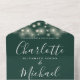 All in one modern minimalist wedding invitation featuring pretty string lights and elegant signature script name and monogram initials on an emerald green background. The invitation includes a perforated RSVP card. Designed by Thisisnotme©