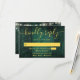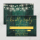 An emerald green string lights rustic wood boho barn RSVP card with your details set in modern gold typography. Designed by Thisisnotme©