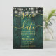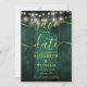 This elegant emerald green string lights rustic barn wood boho wedding save-the-date card can be personalised with your information in chic gold typography. Designed by Thisisnotme©