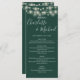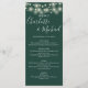 Elegant emerald green wedding menu card featuring pretty string lights and signature style names. This modern menu card can be personalized with your information in chic white lettering. Designed by Thisisnotme©