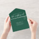 This solid emerald green all in one wedding invitation features classic white typography for a couple getting married in a forest or other nature venue. Celebrate your love with this tranquil colour. Includes a convenient detachable RSVP card.