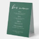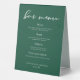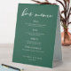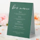 This solid emerald green wedding reception bar menu table tent sign features classic white script for a couple getting married in a forest or other nature venue. Celebrate your love with this tranquil colour and coordinate with our matching minimalist typography collection.