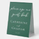This personalised solid emerald green wedding PLEASE SIGN OUR GUEST BOOK table tent sign features classic white script for a couple getting married in a forest or other nature venue. Celebrate your love with this tranquil colour and coordinate with our custom minimalist typography collection.