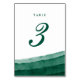 Beautiful emerald green watercolor wedding table number cards, part of our dip-dyed modern watercolor wedding stationery collection. Featuring shades of rich lightly bluish green, reminiscent of emeralds and forests, applied in painterly strokes of rich watercolor wash, matched with simple classic text.