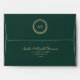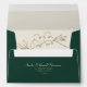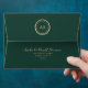 Simple, elegant, modern emerald green 5x7 envelope for wedding invitation with monogram initials on the top flap, return address and unique romantic couple love birds gold foil drawing.
