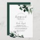 This emerald greenery engagement party invitation is perfect for a boho engagement event. The elegant yet rustic design features moody dark green watercolor leaves and eucalyptus with a modern bohemian woodland feel.