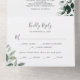 This emerald greenery photo wedding all in one invitation is perfect for a boho wedding. The elegant yet rustic design features moody dark green watercolor leaves and eucalyptus with a modern bohemian woodland feel. Envelopes sold separately.