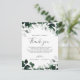 This emerald greenery thank you reception card is perfect for a boho wedding. The elegant yet rustic design features moody dark green watercolor leaves and eucalyptus with a modern bohemian woodland feel. Place these cards at the table setting for each of your guests at your wedding reception. Personalise the card with your names and a special thank you message.