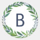 Monogrammed sticker with a hand-drawn wreath of leaves in different hues of green and blue.