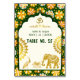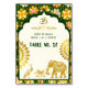 This customisable elegant traditional Hindu wedding table number card features a rich emerald and marigold design with an ivory moghul arch, beautifully accented by gold details of lotus, peacock, elephant, and an Om symbol. Your names, wedding date, and table number are displayed on the front and backside in a luxurious and festive layout.