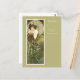A postcard featuring the art illustration by Alphonse Mucha (1860-1939) titled Emerald from the Precious Stones Series (1900). A portrait a fashionable woman in a green gown, with green foliage in the foreground. The chair has animal heads which was inspired by a chair Mucha owned.