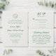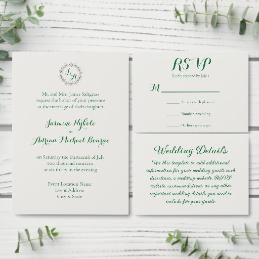 This elegant wedding invitation features a delicate circle of leaves and vines framing your initials at the top, paired with classic serif fonts and romantic emerald script on a soft ivory background for a timeless, refined look.