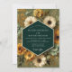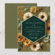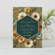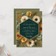 A rich tapestry of florals unfolds in this elegant and moody design. Set against a deep emerald green background, painterly golden marigold and cream gerbera daisies bloom with vintage charm. Delicate foliage weaves throughout the composition, creating a lush and opulent atmosphere for a sophisticated affair.