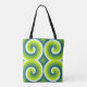 This image is a seamless geometric pattern featuring four bold spiral gradients arranged symmetrically around a diamond shape at the centre. The design uses vibrant shades of green, lime, and teal, creating visually hypnotic swirls that evoke a sense of energy and movement. The spirals are evenly spaced and mirrored on both axes, emphasising balance and harmony while the colour progression flows outward in smooth transitions.