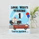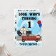 First birthday invitations featuring emergency vehicles of fire engine and police cruiser and text that reads "Look Who's Turning 1"!