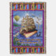 The original fantasy scene on this throw blanket is based around the Emily Dickinson poem that begins, "There is no Frigate like a Book To take us Lands away." The quote appears at the bottom, below a masted sailing ship made of an antique book. The words are also scrawled throughout: on the torn-looking sails, wrapped around the balloon in the distance, decorating the wings of a dragonfly that has a pencil body. They even faintly appear on the faded rainbow.