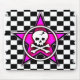 This Emo Chequerboard features a pink graphic star with a cartoon skull & crossbones image on a black & white checkers background.