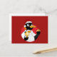 Postcard with an illustration of a cute emperor penguin with a red Santa hat; Christmas holiday cartoon design for kids, on a red background