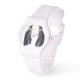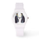 The design on this Sporty Watch is an illustration of two Antarctic Emperor Penguins facing each other. The Emperor Penguin is similar to the King penguin. On the Emperor the orange on the face blends into white. On the King penguin the orange is seperated from the white with a strip of black. Hand illustrated using Derwent Water Colour Pencils.