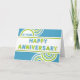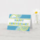 This is a bright, eye catching, employee 10th anniversary card in blue, green and white. The design features the centrally placed text 'HAPPY ANNIVERSARY' in a layered effect font. Above and below this text are circular, decorative elements in matching colours to the text. The number of years is written within the lower of the two circular shapes above the central text.