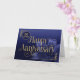 This is an Employee 30th Anniversary card featuring the text 'Happy Anniversary' written in an elegant font with flowing swashes. The text and details of the design have an attractive gold foil effect overlay. The background consists of a mid to dark blue gradient, with an eye catching lily flower, in matching shades of blue, in the lower right hand corner. The number of years is in the upper left.