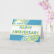 This is a bright, eye catching, employee 4th anniversary card in blue, green and white. The design features the centrally placed text 'HAPPY ANNIVERSARY' in a layered effect font. Above and below this text are circular, decorative elements in matching colours to the text. The number of years is written within the lower of the two circular shapes above the central text.