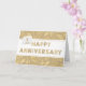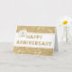 This is a neutral toned employee 7th anniversary card with a delicately contrasting gold foil effect leaf design in the background. The design features the centrally placed text 'HAPPY ANNIVERSARY' in a layered effect font with gold foil effect diagonal lines on every other letter. The number of years is written on an off white note and washi tape styled rectangle, up and to the left of the central text.
