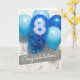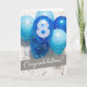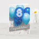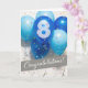 This is an Employee 8th Anniversary card featuring a colour photographic image of blue balloons. On one of the balloons is the number 8. There is also digitally simulated colourful confetti. In the lower section of the card, is the text 'Congratulations!' written at a jaunty angle over a grey text box.