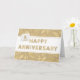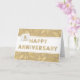 This is a neutral toned employee 8th anniversary card with a delicately contrasting gold foil effect leaf design in the background. The design features the centrally placed text 'HAPPY ANNIVERSARY' in a layered effect font with gold foil effect diagonal lines on every other letter. The number of years is written on an off white note and washi tape styled rectangle, up and to the left of the central text.