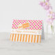 A fun, colourful fifteen years employee anniversary card with a bold summer fresh vibe. There is a large pink polka dots on white pattern in the top half; some of the polka dots have a gold sparkle effect overlay, and a bold, orange and white vertical stripes pattern, with the addition of decorative interspersed thin gold sparkle effect vertical lines, in the bottom half.