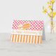 A fun, colourful twenty years employee anniversary card with a bold summer fresh vibe. There is a large pink polka dots on white pattern in the top half; some of the polka dots have a gold sparkle effect overlay, and a bold, orange and white vertical stripes pattern, with the addition of decorative interspersed thin gold sparkle effect vertical lines, in the bottom half.
