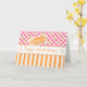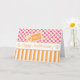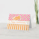 A fun, colourful five years employee anniversary card with a bold summer fresh vibe. There is a large pink polka dots on white pattern in the top half; some of the polka dots have a gold sparkle effect overlay, and a bold, orange and white vertical stripes pattern, with the addition of decorative interspersed thin gold sparkle effect vertical lines, in the bottom half.