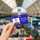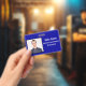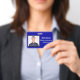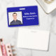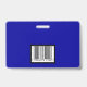 Horizontal Employee ID badge with Royal Blue background. All elements are changable or removable. Elements include: employee photo, employee name, company name, employee department. Back of design has security barcode scan. Available in vertical orientation. Slot at top for lanyard.