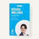 An employee ID card featuring a personal photo. The design shows the employees photograph in the lower right corner, as well as the employee name in bold white letters. Furthermore it includes the employees occupation and badge ID number. The modern staff badge can be personalised with your company's logo and business name. Add more information, such as a bar code or employee contact details to the back if desired. The colours can be personalised to match your company's colour scheme.