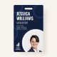 An employee ID card featuring a personal photo. The design shows the employees photograph in the lower right corner, as well as the employee name in bold white letters. Furthermore it includes the employees occupation and badge ID number. The modern staff badge can be personalised with your company's logo and business name. Add more information, such as a bar code or employee contact details to the back if desired. The colours can be personalised to match your company's colour scheme.