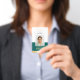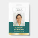 Create a professional appearance with this personalised identification badge. A simple and stylish template with your ID photo, name, job title, company logo, and scannable QR code. All the text can be customised or deleted to suit your business needs. This elegant design would suit many different workplaces and professions, including corporate professionals, retail salespersons, beauty consultants, hotel staff, small businesses, conference name tags and more! Printed colours: teal green and white with a faux gold gradient.