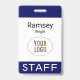 Personalise our professional employee name badge with your company logo, employee name, or other custom text. It's pvc plastic and available with a metal clip, lanyard, or a retractable reel. This is a navy blue name badge with a modern minimalist design. You can easily customise the colours, fonts, and design and optionally add content to the back. No minimum order quantity and no setup fee.