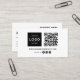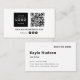 Modern personalised business card features a business logo image, custom QR code, and website on the front with social media follow icons. The back of the card includes the business name, employee, job title, and contact information. Black and white design can be completely customised to suit your style. Choose the customisation option to change the colours, font styles, and more!