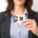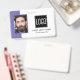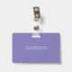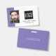 Smart business office ID badge featuring a purple and white background, a photo of the employee, your company logo, name and profession.