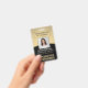 **Please note that the background is printed to look metallic, but the product is not made of metal and is not foil.** Represent your business in style by supplying staff with with modern and professional identification badges. The Logo, photo, bar code and all wording on this template are all simple to customise. The black and gold design features a faux metallic background with an elegant curved arc, your company logo, one square picture, employee name and title, and UPC / barcode on back. It can provide organisation and security for company staff, while presenting the corporate branding with a stylish classic appearance. Please note that gold is printed colour, not metallic foil.
