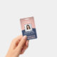 **Please note that the background is printed to look metallic, but the product is not made of metal and is not foil.** Represent your business in style by supplying staff with with modern and professional identification badges. The Logo, photo, bar code and all wording on this template are all simple to customise. The navy blue and pink design features a faux rose gold background with an elegant curved arc, your company logo, one square picture, employee name and title, and UPC / barcode on back. It can provide organisation and security for company staff, while presenting the corporate branding with a stylish classic appearance. Please note that rose gold is printed colour, not metallic foil.