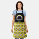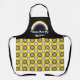 Medium-sized apron with an image of a non-binary pride flag and a rainbow, and repeating seamless flower pattern; black, yellow, white, and purple design on a black background, a yellow variant, with a customizable text template for your own name or message