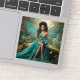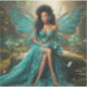 A stunning digital illustration of a beautiful woman as a forest fairy, featuring large turquoise glittery wings and an elegant teal gown. She sits gracefully in a magical woodland setting surrounded by glowing butterflies and soft forest light.