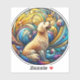 A golden retriever dog sits at the centre of an intricately designed , surrounded by a colourful swirl of cosmic-like patterns. The lively curves and hues of blues, purples, and gold create a playful yet surreal atmosphere, as if the dog is caught in a celestial dance among otherworldly bubbles and waves.