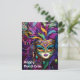 💚💜💛The postcard features a stunning close-up of a Mardi Gras performance artist, captivating with their entrancing presence. Their visage is adorned with intricate and beautiful makeup, a mesmerising fusion of deep purples, vibrant turquoise, and shimmering golds, creating a spellbinding allure. The makeup highlights their eyes, adding an ethereal quality to their appearance.