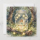 A beautiful fairy tale themed blank notecard. The lovely illustration has a fairy girl swinging on a magical swing inside of a mason jar in an enchanted garden in the forest. Fairy lights adorn the trees and swing.