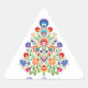 A triangular sticker adorned with a holiday marvel against a pristine white background showcases a majestic Christmas tree, standing gracefully amidst a snowy landscape. Diverging from tradition, the tree is embellished with meticulously crafted folklore-inspired flowers, echoing the artistry of Poland's "wycinanki."